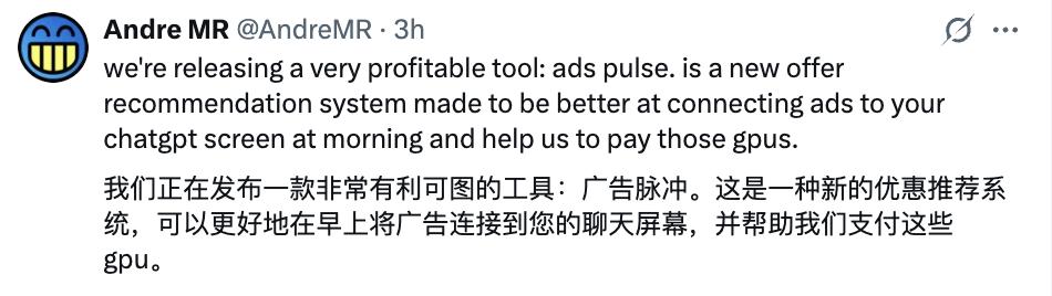 但网友好像不太买账,表示:这简直是广告推荐神器,可以在早上将广告更好地连接到聊天界面,为GPU来圈钱了。