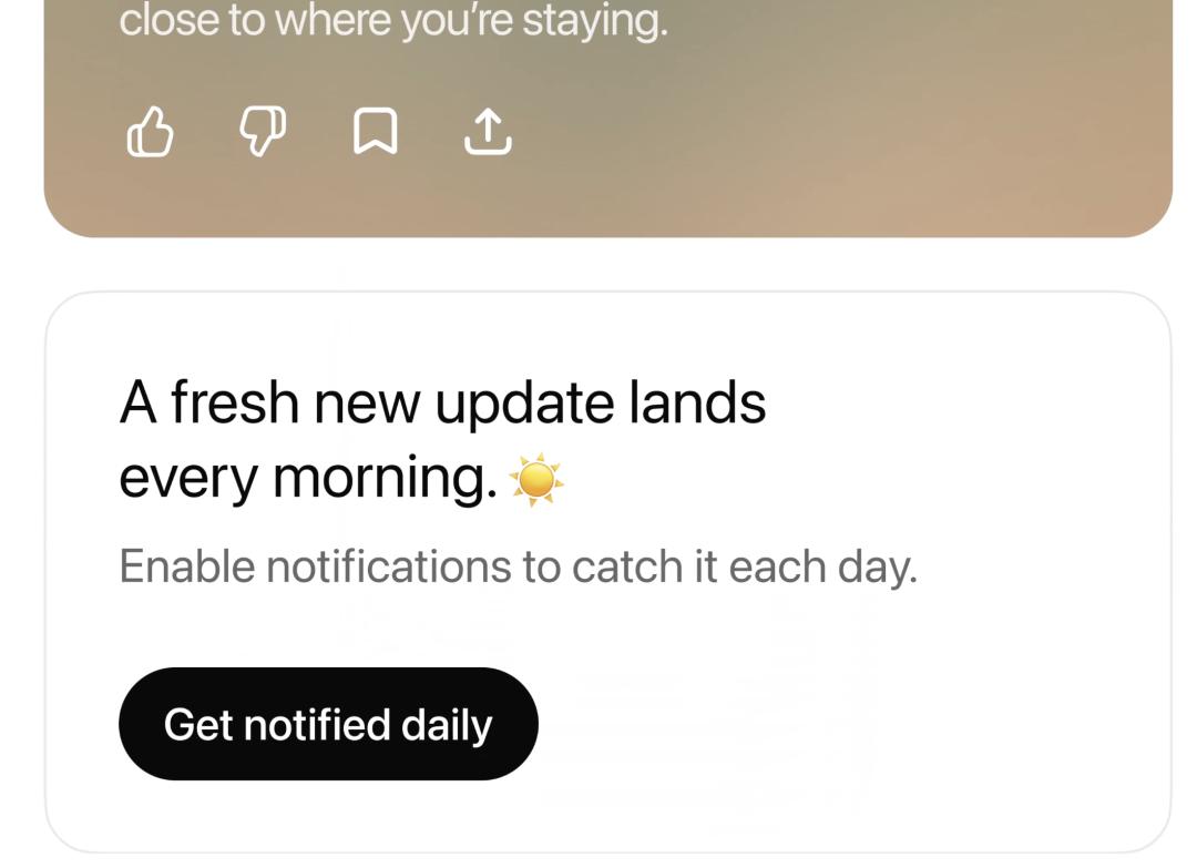它甚至准备了一份“KAIYO屋顶餐厅晚餐攻略”,针对她的无乳糖习惯推荐了合适的菜品。Pulse还会主动询问:“最近在想什么?我会记住并用于明天的更新”,并给出像“我对……很好奇”、“我接下来的计划是……”、“我想持续跟进……”这样的选项,邀请她分享想法以优化未来的建议。