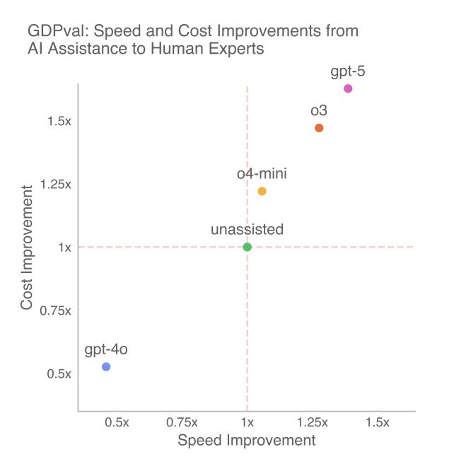 GDPval的早期结果已经表明,大模型在处理那些重复性强、结构清晰的任务时,效率远超人类专家,不仅更快也更便宜。