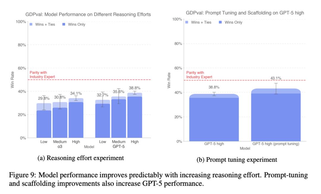 为了验证是否可以提升GPT-5在GDPval任务中的表现,OpenAI增量训练了实验性的内部特定版GPT-5。