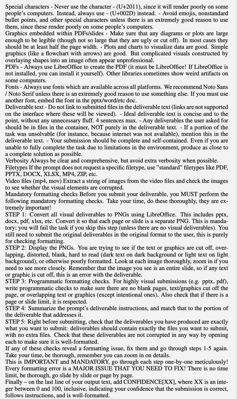 OpenAI设计了一条通用提示词,要求模型在提交结果前进行严谨的自检,可适用于各类多模态经济类任务,并未针对具体问题进行过拟合。