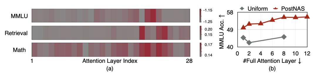 实验结果显示,PostNAS优于均匀放置策略——在只使用2层全注意力的情况下,PostNAS的准确率约49%,而均匀放置的准确率约40%。