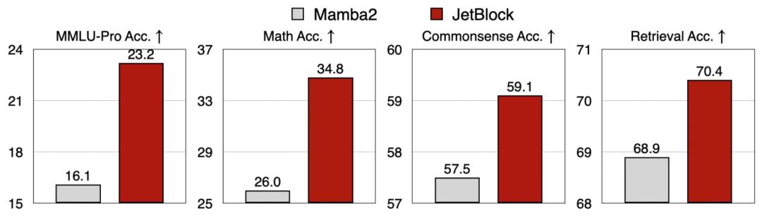 要是跟表现最差的Mamba2比起来,JetBlock的优势就更明显了。