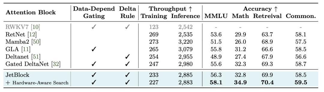 结果显示,JetBlock在数学推理和检索任务上的准确率优于Gated DeltaNet,而且仍然保持了不错的生成效率。