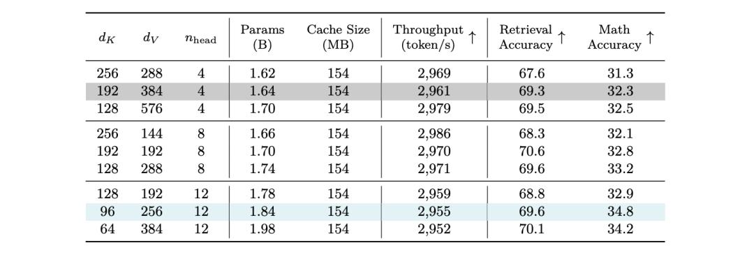 基于此,英伟达团队选择保持KV缓存大小与原始设计一致,然后在key维度、value维度和注意力头数上进行小规模网格搜索。