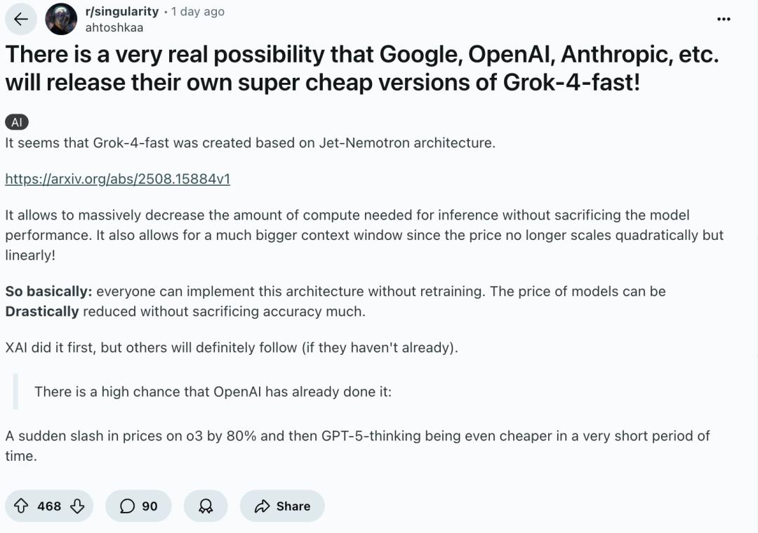 在Reddit上,有网友推测Grok-4-Fast应该就是基于Jet-Nemotron创造的。