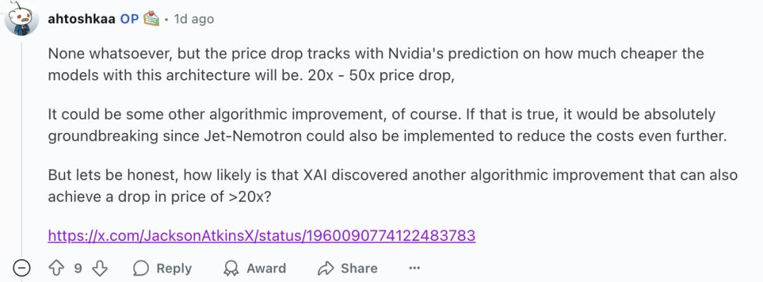 当然,也可能是其他算法上的突破。如果真是这样,那仍然是极具突破性的,因为Jet-Nemotron也可以被用来进一步降低成本。但说实话,XAI真的又发现了一个能让价格再下降20倍以上的算法改进的可能性有多大呢?