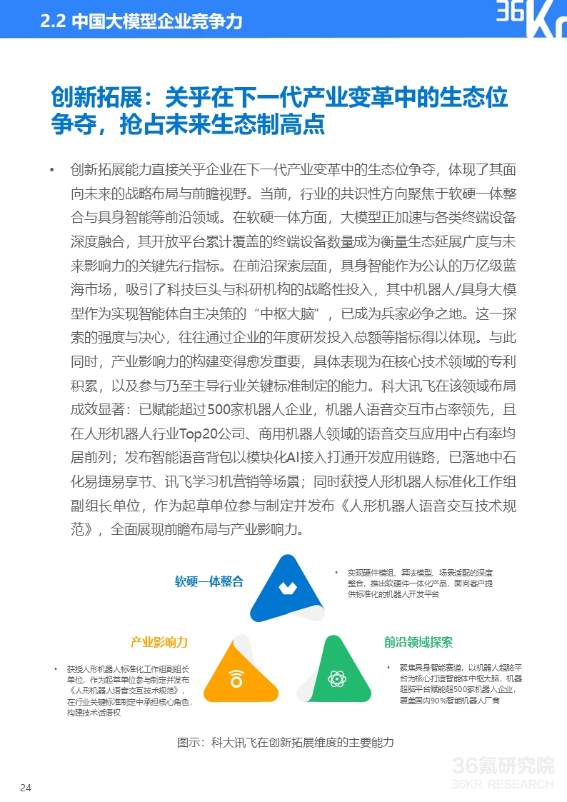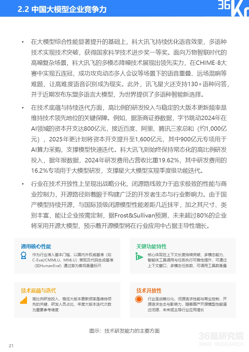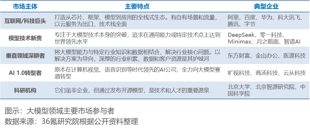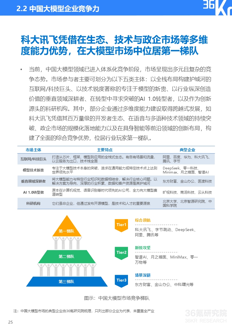 当前,中国大模型领域已进入体系化竞争阶段,市场呈现出多元且复杂的竞争态势。市场参与者主要可划分为以下五类主体:以全栈布局构建护城河的互联网/科技巨头、以技术锐度著称的专注于模型的新贵、以行业纵深创造价值的垂直领域深耕者、在转型中寻求突破的AI 1.0转型者,以及作为创新源头的科研机构。其中,部分企业通过多维度能力建设取得跨越式发展,如科大讯飞凭借其百万量级的开发者生态、在语音与多语种技术领域的持续突破、政企市场的规模化落地能力以及在具身智能等前沿领域的创新布局,构建了全面的综合竞争优势,位居行业玩家第一梯队。