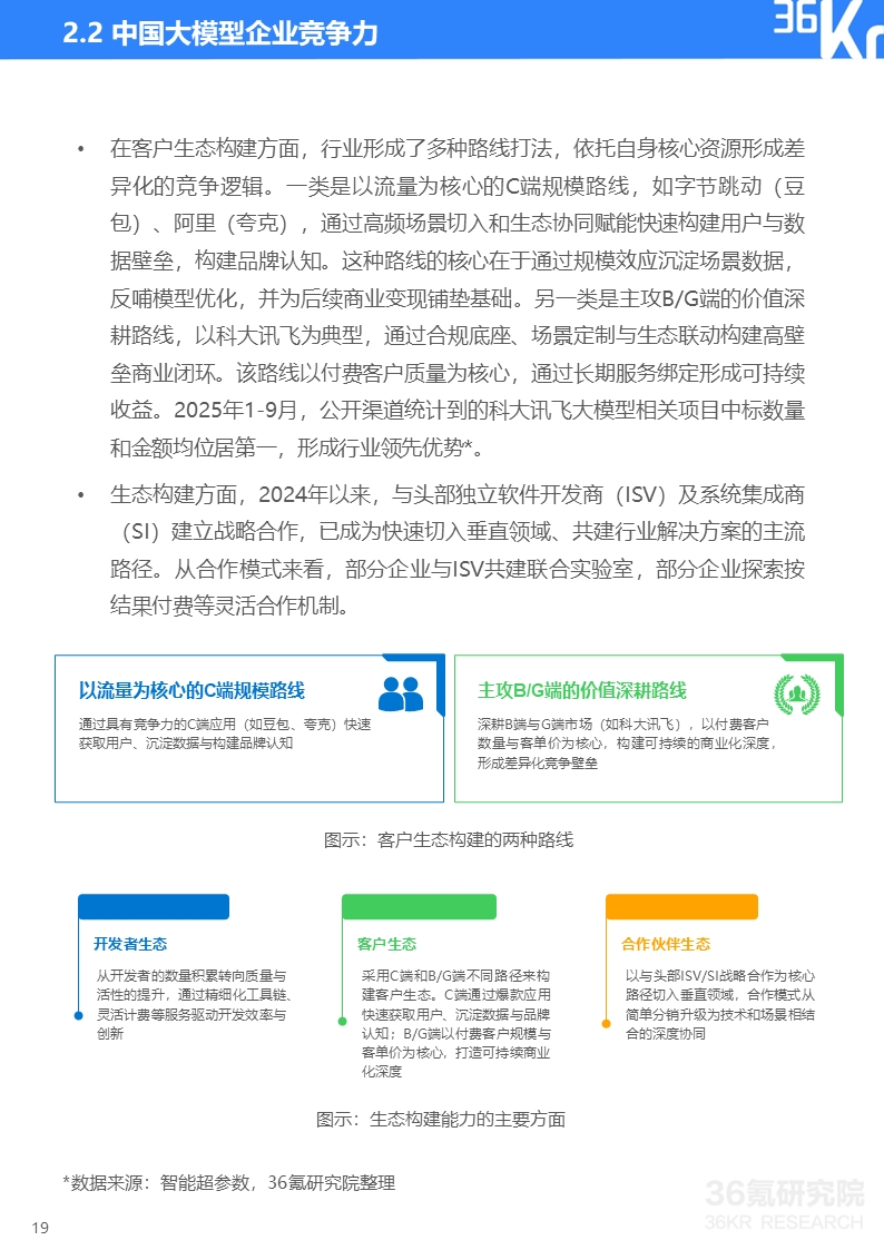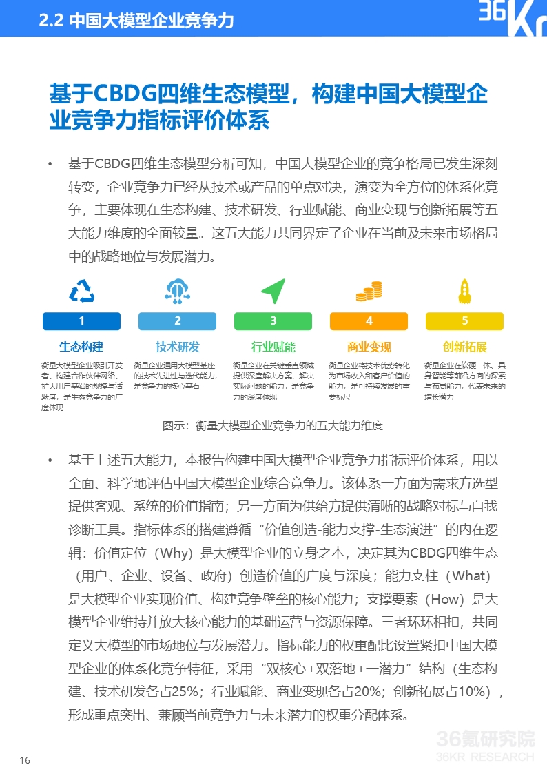 依托中国市场特点与国家政策导向,消费者、企业、设备、政府(CBDG)四大维度构成中国大模型发展新范式。四大维度形成高效运转的飞轮效应,理解CBDG是把握中国大模型市场增长逻辑的关键。以CBDG分析可知,中国大模型企业的竞争格局正在发生深刻转变,从技术和产品单点对决转向全方位的体系化竞争,核心是生态构建、技术研发、行业赋能、商业变现、创新拓展五大能力的全面较量。五大能力共同界定了大模型企业在当前市场的战略地位和未来发展潜力。