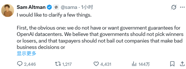 总结来说,奥尔特曼强调OpenAI不想,也不会寻求政府为其数据中心提供担保。同时OpenAI也不会寻求“大而不能倒”,如果公司最终搞砸了,那么该倒闭就倒闭。