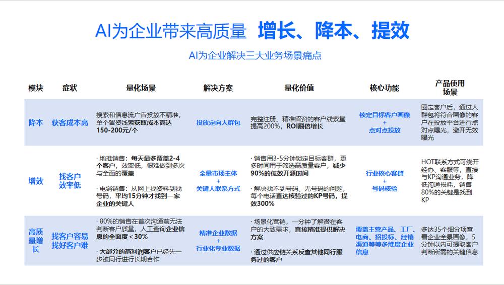 AI实现:通过定向人群包精准投放,降低获客成本。例如,探迹AI帮助客户圈定“深圳地区年营收5000万以上的医疗设备企业”,仅向该群体推送广告,使留资成本降低50%以上。