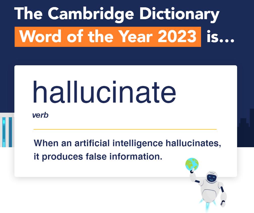 英国剑桥词典2023年选择的年度词汇是“hallucinate”。“hallucinate”本意主要用来指因为生病或服药副作用,导致出现幻觉、看见不存在的东西。在AI时代,它被赋予了全新的技术含义,人们开始用它描述大语言模型胡编乱造、产出虚假信息的现象。