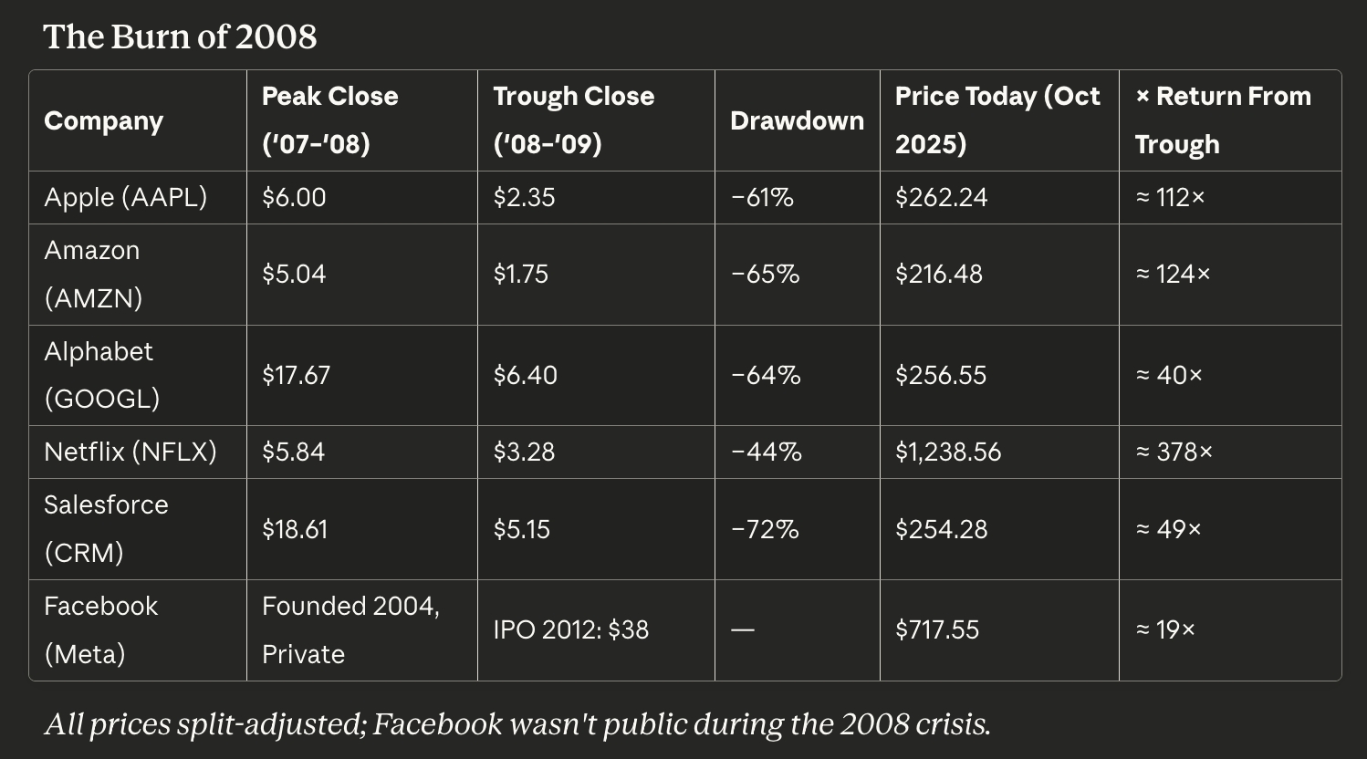 2000 年的野火是一场彻底的焚烧。基础设施过度建设、宽松的资本和投机性的狂热,几乎烧掉了所有没有盈利的增长故事。然而,留下的是根系——数据中心、光纤,以及那些学会了把根扎牢,慢慢发展的幸存公司。