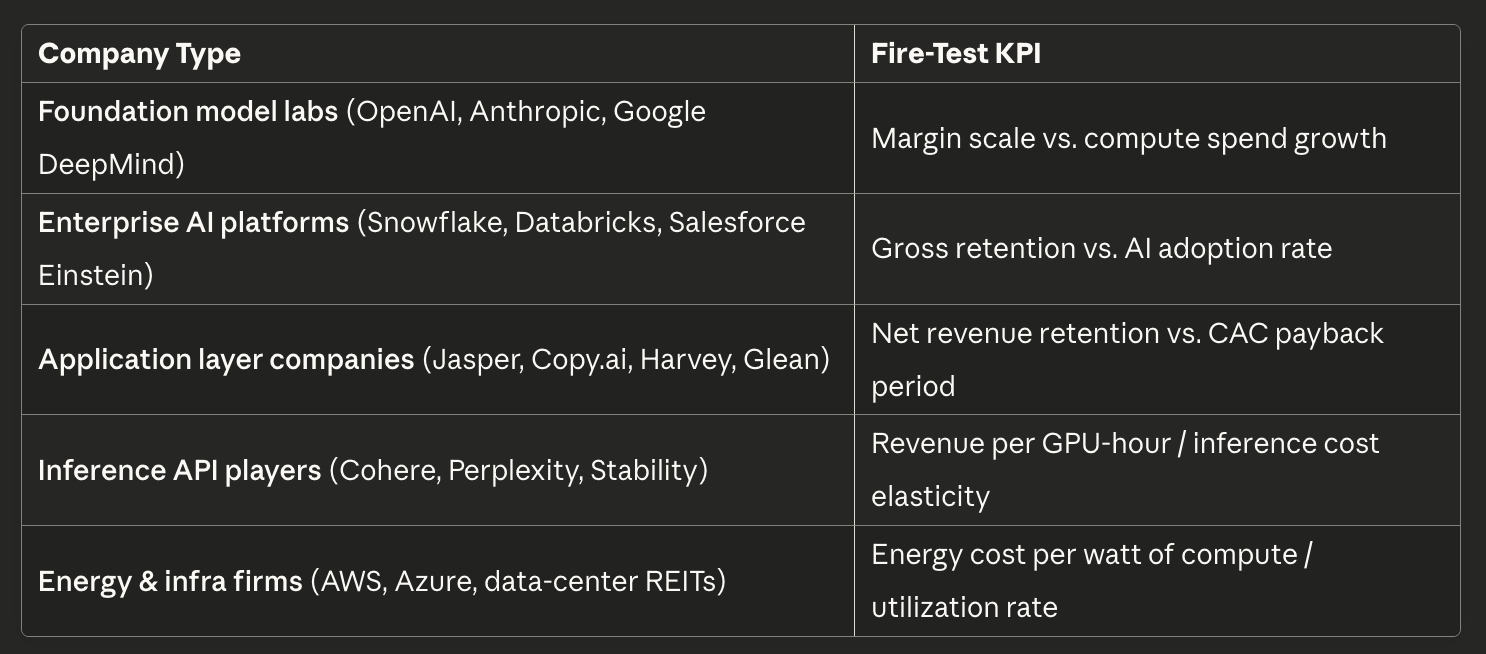 “元模式”(meta-pattern):每个指标都从不同角度提出了同一个问题——当外部资本消失时,你是否仍能维持你的商业模式?耐火型公司已经实现了“热力学上的可持续性”:每单位输入(资本、计算、能源)都能产生更高的单位输出(收入、价值、效率)。它们能在稀缺中成长。而易燃的灌木消耗大于产出,只能靠充裕的资本来补贴。一旦补贴结束,它们就会被点燃。