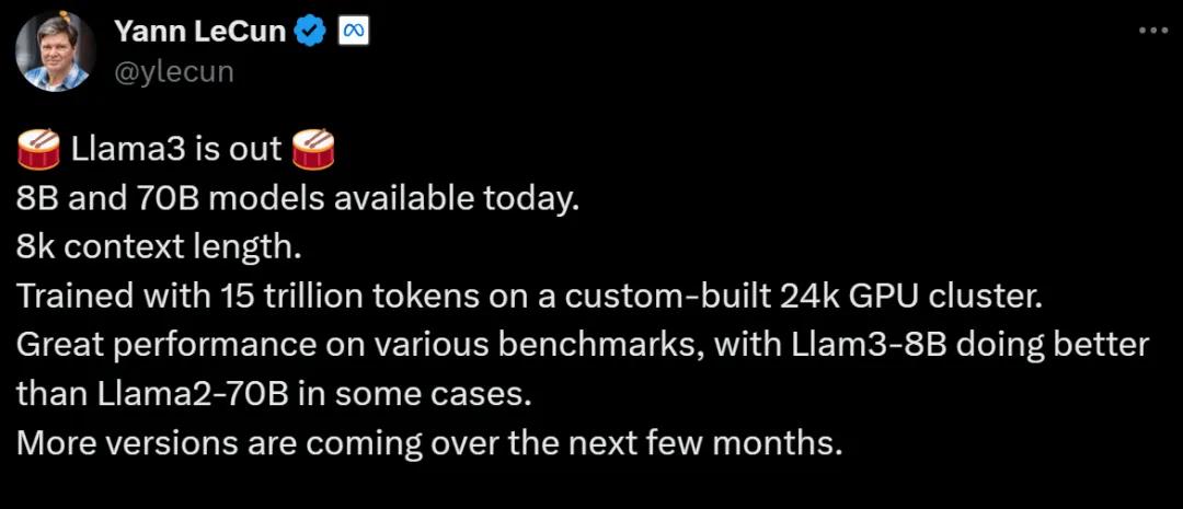并且Meta还透露,之后还将推出400B版本的Llama 3,它的测试成绩可是在很多方面上都追上了OpenAI闭源的GPT-4,让很多人都直呼,开源版的GPT-4就要来了。尽管在参数量上来看,相比Llama 2,Llama 3并没有特别大的提升,但是在某些表现上,Llama 3最小的8B版本都比Llama 2 70B要好。可见,模型性能的提升,并非只有堆参数这一种做法。