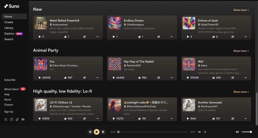Suno取得成功的另一要素是,它不仅是个AI音乐生成工具,还是个音乐平台和音乐社区。在首页中,你能看到新鲜的AI作品案例,还能看到最受欢迎的作品排行榜,更有分门别类的播放列表供选择。你也可以通过名字、风格或歌词内容搜索作品。你能看到其他用户发布的作品,看到作品的播放量和点赞量,也可以分享自己的作品。