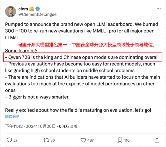 同时Hugging Face的联合创始人Clem还发了推特(现在叫X):阿里最新开源的通义千问Qwen2-72B指令微调版本卫冕冠军,继续位列全球开源模型排行榜第一名。