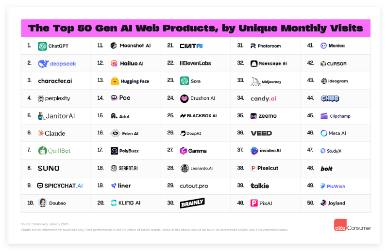 风险投资公司 Andreessen Horowitz (a16z) 最新发布的消费者人工智能领域报告揭示了显著的市场动态。报告追踪了排名前100的消费级 AI 应用,通过 Similarweb 的网络访问数据和 Sensor Tower 的移动应用数据进行排名,每两年更新一次。最新排名显示,自2024年8月以来,有17家新公司跻身前50名,标志着市场格局的重大变化。