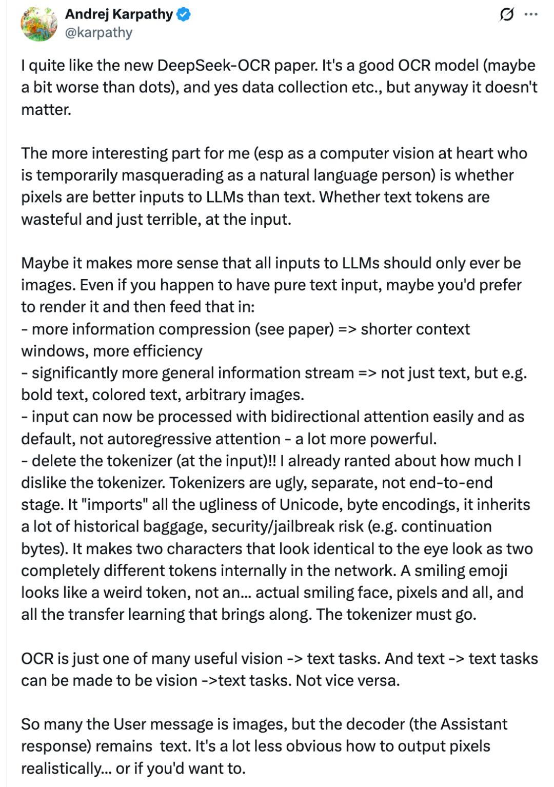 信息压缩:他明确引用了DeepSeek-OCR论文的观点,这将带来“更短的上下文窗口和更高的效率”。