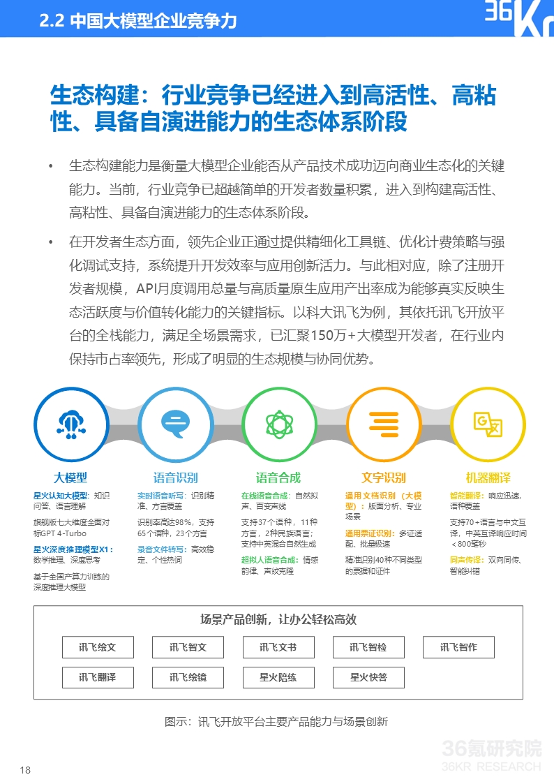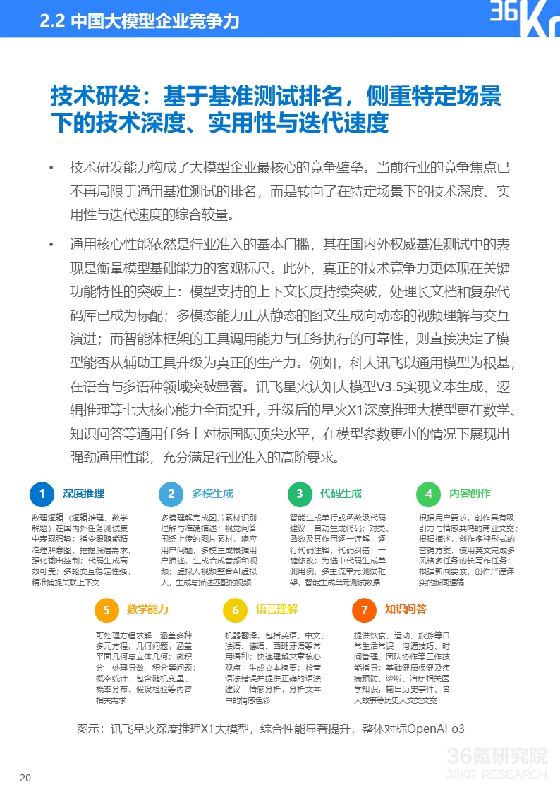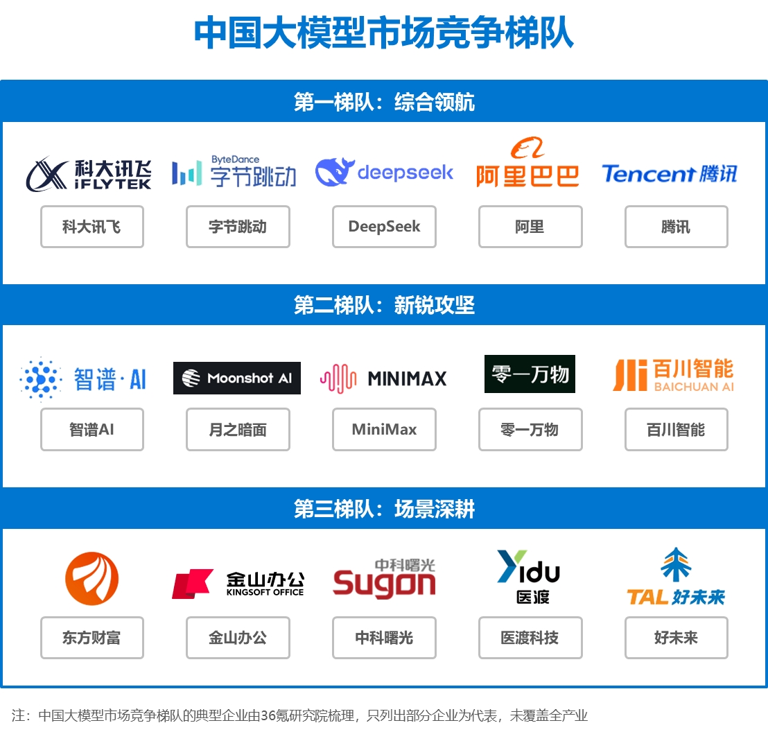 当前,中国大模型领域已进入体系化竞争阶段,市场呈现出多元且复杂的竞争态势。市场参与者主要可划分为以下五类主体:以全栈布局构建护城河的互联网/科技巨头、以技术锐度著称的专注于模型的新贵、以行业纵深创造价值的垂直领域深耕者、在转型中寻求突破的AI 1.0转型者,以及作为创新源头的科研机构。其中,部分企业通过多维度能力建设取得跨越式发展,如科大讯飞凭借其百万量级的开发者生态、在语音与多语种技术领域的持续突破、政企市场的规模化落地能力以及在具身智能等前沿领域的创新布局,构建了全面的综合竞争优势,位居行业玩家第一梯队。