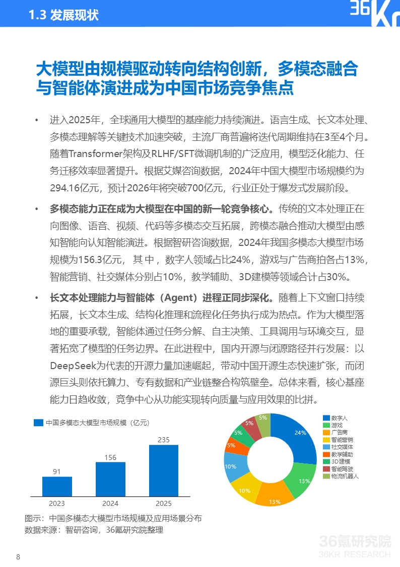 当前,中国大模型行业正迎来一场由技术迭代与生态重构共同驱动的关键变革。报告数据显示,2024年中国大模型市场规模已达294.16亿元,预计到2026年将突破700亿元,其中多模态大模型市场规模为156.3亿元,数字人、游戏等场景应用表现亮眼,增长势能显著。随着行业加速发展,大模型的市场竞争逻辑也在发生转变:从技术或产品的单点对决,转向涵盖生态构建、技术研发、行业赋能等多维度的体系化较量。技术演进方面,多模态认知和具身智能等前沿领域正成为关键发展方向。在此背景下,如何依托CBDG四维生态(消费者、企业、设备、政府)把握市场增长核心逻辑,实现技术价值向商业闭环的有效转化,成为大模型企业高质量发展的核心命题。