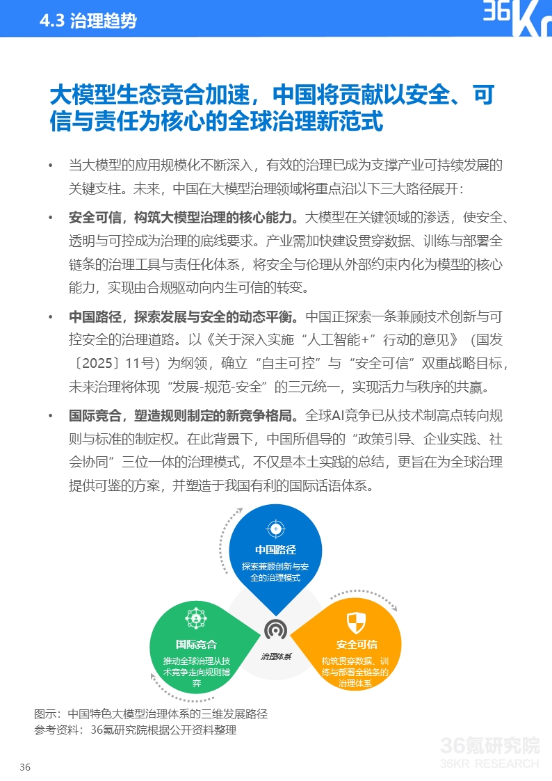 中国将大模型视作科技自立自强和产业体系重塑的重要支点。目前,中国大模型产业政策正在形成“创新驱动、基础强化、场景牵引、安全治理”四位一体的发展格局。一方面,通过顶层设计与政策协同,为大模型提供了持续演进的制度环境;另一方面,通过算力、算法、数据、安全等要素的系统推进,建立创新驱动与责任治理并重的发展路径。