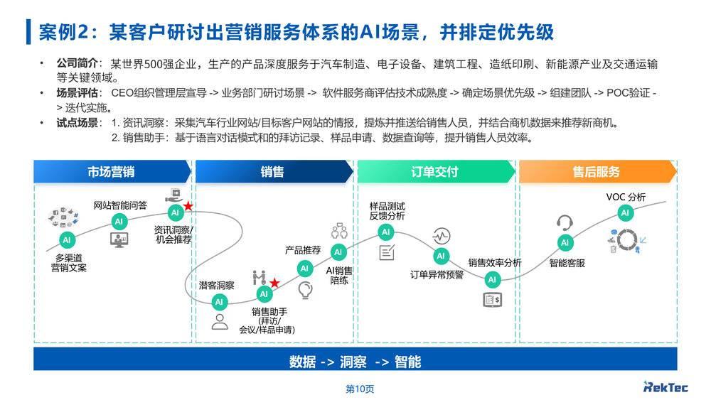 而围绕客户旅程的AI场景化赋能,需要结合场景(获客、转化、交付、服务)梳理潜在AI应用点。他以某世界500强汽车零部件企业的服务案例为例,详细分享了如何系统性地寻找和落地AI场景。