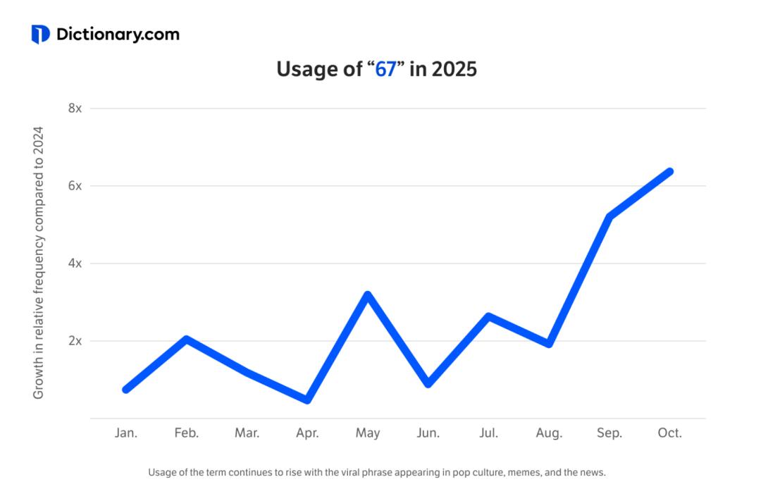 Dictionary.com正式公布的2025年年度词汇是“67”,不是读成sixty-seven,而是six-seven。根据官方的说法,Dictionary.com的词汇团队分析了包括新闻标题以及社交媒体趋势在内的大量数据,发现从2025年6月开始,“67”的搜索量出现了显著上升。