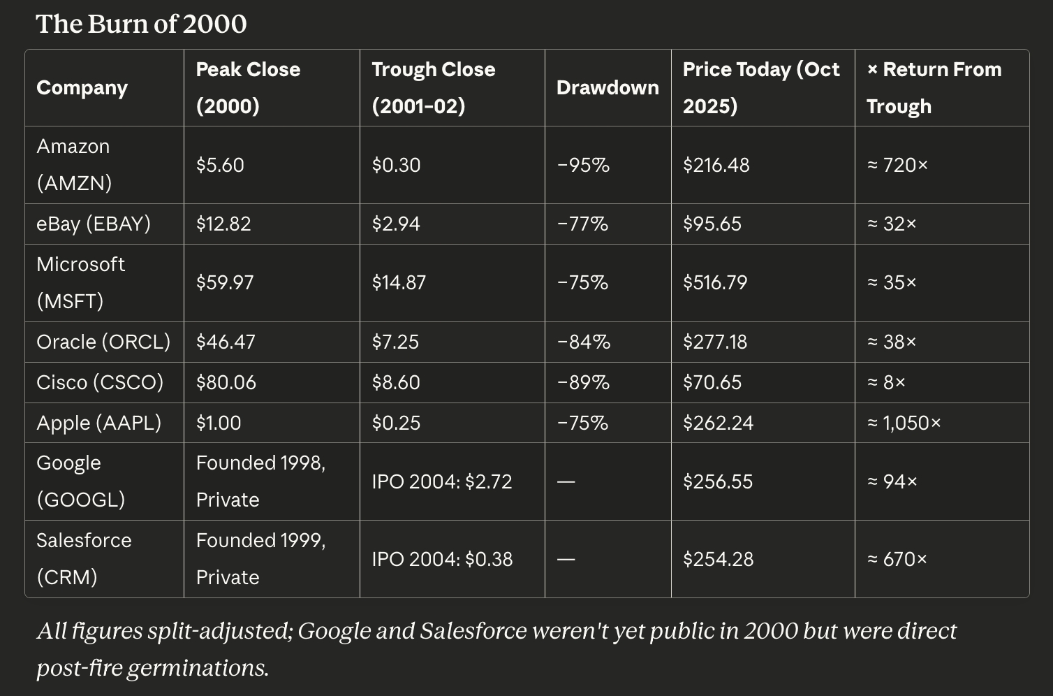 2000 年的野火是一场彻底的焚烧。基础设施过度建设、宽松的资本和投机性的狂热,几乎烧掉了所有没有盈利的增长故事。然而,留下的是根系——数据中心、光纤,以及那些学会了把根扎牢,慢慢发展的幸存公司。