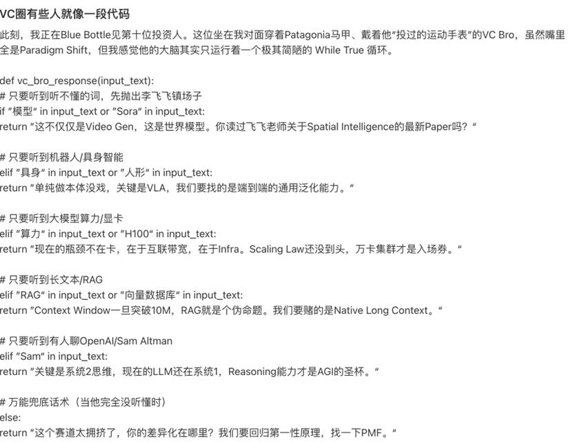 作为一个软件相关专业的学渣,“If、else、return”是我学生时代为数不多能理解的程序语言之一。这位小红书博主的意思是,到了现在的AI时代,世界模型,VLA、Scaling Law 万卡集群、LLM、第一性原理、PMF这些词汇,看起来也成了投资人的“If、else、return”。