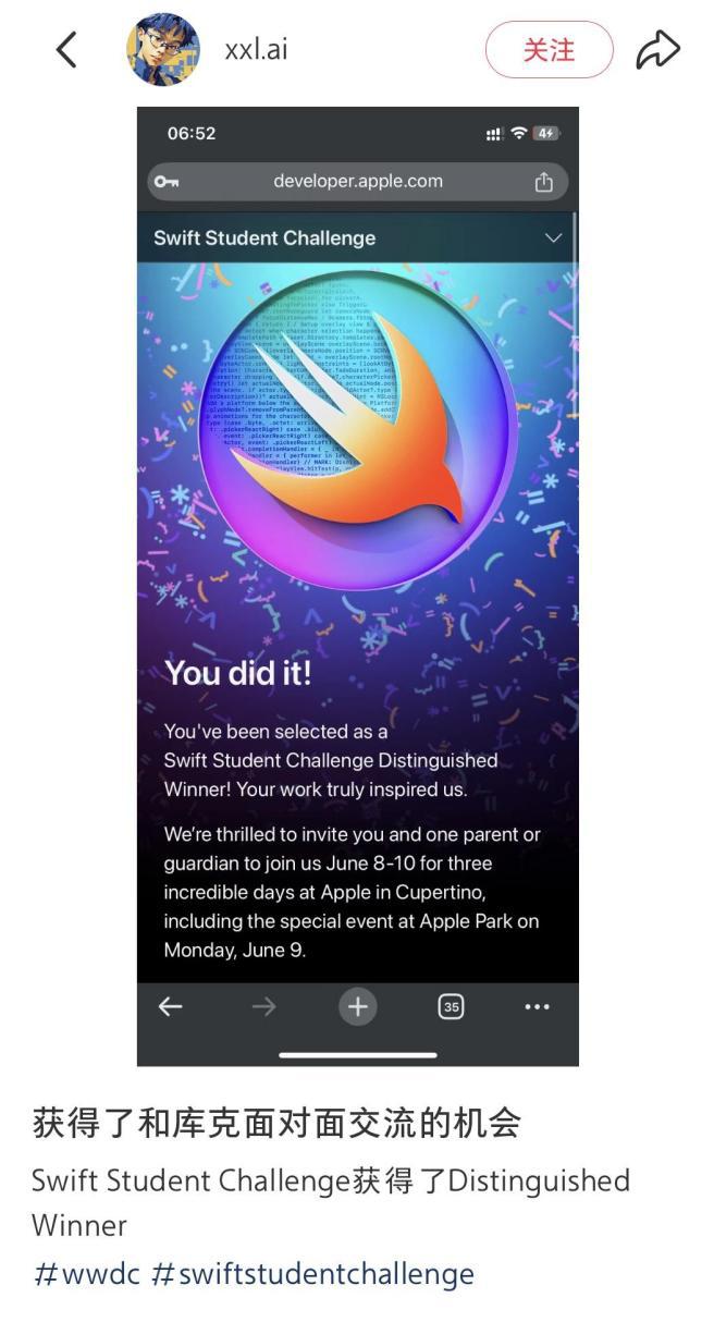 3月28日,冼星朗收到了好消息,但超出预期的是,他成了杰出获奖者中的一员,并被邀请去美国参加Apple全球开发者大会(WWDC25),继续接下来的赛程。“这是我开发以来最大的荣誉,也是最自豪的事情。”